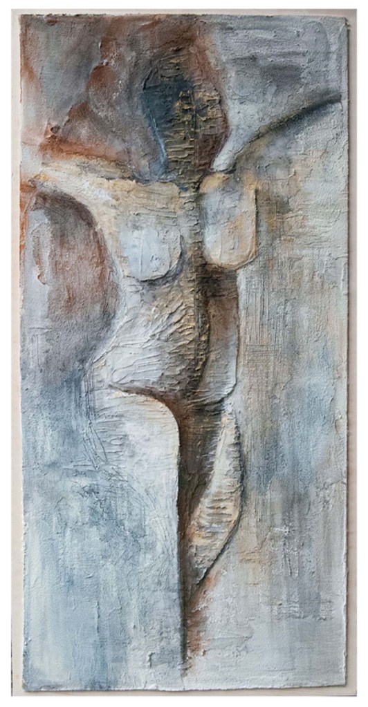 DONNA IN PIEDI cemento e acrilico su tavola 124×62,5cm 2025