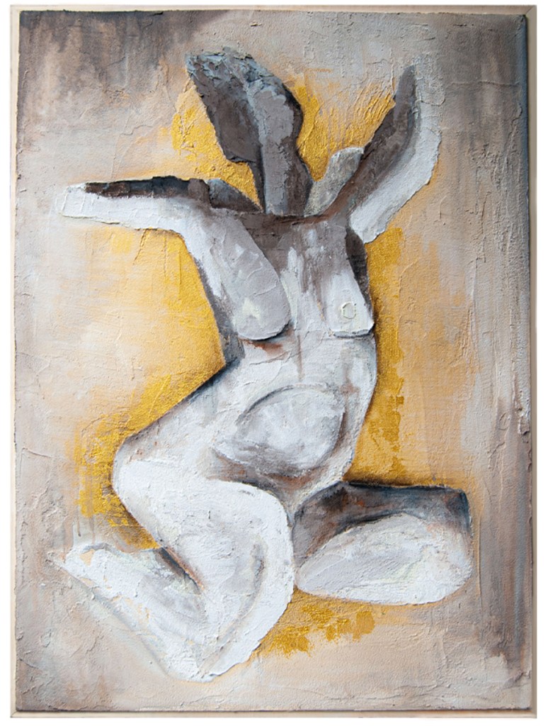 DONNA SEDUTA cemento e acrilico su tavola 125x93cm 2025