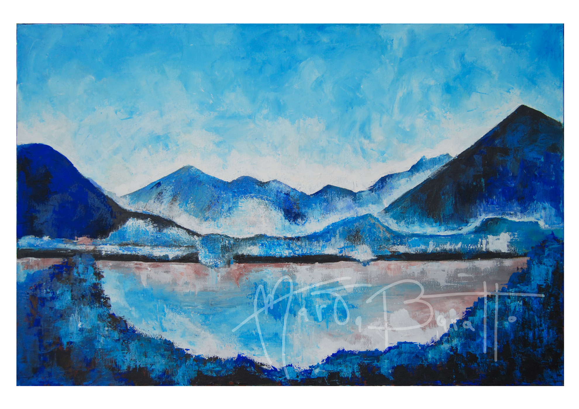 sembra magico e infinito, le montagne assomigliano a piramidi che scompaiono nella luce. L’uso della spatola per dipingere aggiunge una dimensione tattile all’opera, permettendo al colore di fondersi e creare texture che danno vita alla scena. La rappresentazione artistica del fiume, che fluisce attraverso la valle e si immerge nel lago di Como, simboleggia un viaggio attraverso il tempo e lo spazio, dove la realtà si intreccia con il sogno e il ricordo. Questa tecnica pittorica non solo riflette la bellezza naturale, ma invita anche a una riflessione personale sul significato più profondo del paesaggio e del suo impatto sull’anima umana.
