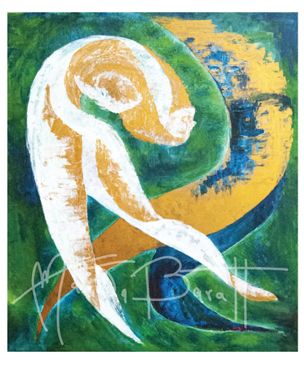 Visual art has the power to convey deep emotions and concepts through the use of color, form, and composition. The description provided conjures up the image of a canvas that captures the essence of a ritual dance, where the gold used to illuminate the abstract figures adds an element of sacredness and splendor.This artistic representation, with its green backdrop symbolizing nature, creates an atmosphere that goes beyond the physicality of the space, inviting the viewer to immerse themselves in an experience that is both visual and emotional. The lack of real physical perspectives is an invitation to focus on the movement and energy of the figures, rather than their placement in space, suggesting a more imaginary and universal interpretation of the human experience.